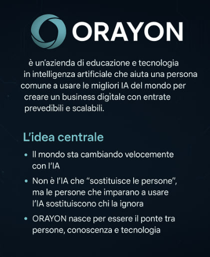 ORAYON è un progetto di educazione e tecnologia in Intelligenza Artificiale dedicato alla formazione, agli strumenti digitali e ai modelli di business online. Tutti i contenuti hanno finalità informative ed educative. I risultati dipendono dall'impegno personale.